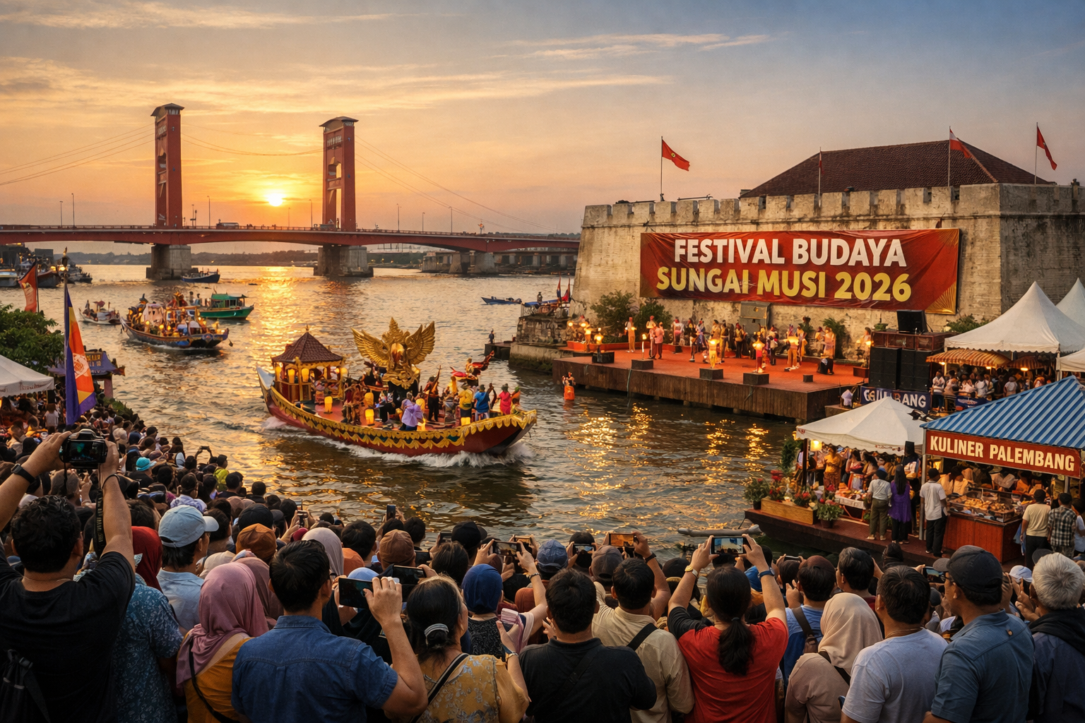 Ribuan warga memadati kawasan Benteng Kuto Besak dalam rangka Festival Budaya Sungai Musi 2026 yang digelar oleh Pemerintah Kota Palembang. Kegiatan tahunan ini menjadi magnet wisata sekaligus upaya melestarikan budaya lokal Sumatera Selatan, pada Kamis 19 Februari 2026.