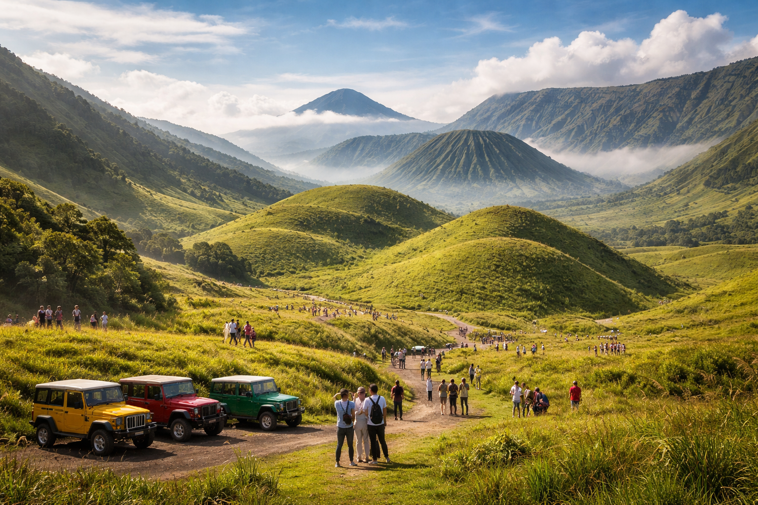 Hamparan perbukitan hijau yang dikenal sebagai Bukit Teletubbies kini menjadi salah satu spot favorit wisatawan di kawasan Taman Nasional Bromo Tengger Semeru. Lokasinya berada di sekitar area Gunung Bromo, tepatnya di wilayah Kabupaten Malang dan Kabupaten Probolinggo, Jawa Timur, Kamis 19 Februari 2026.