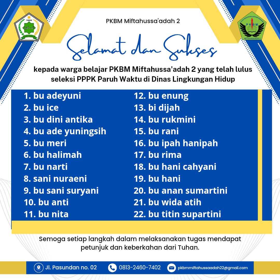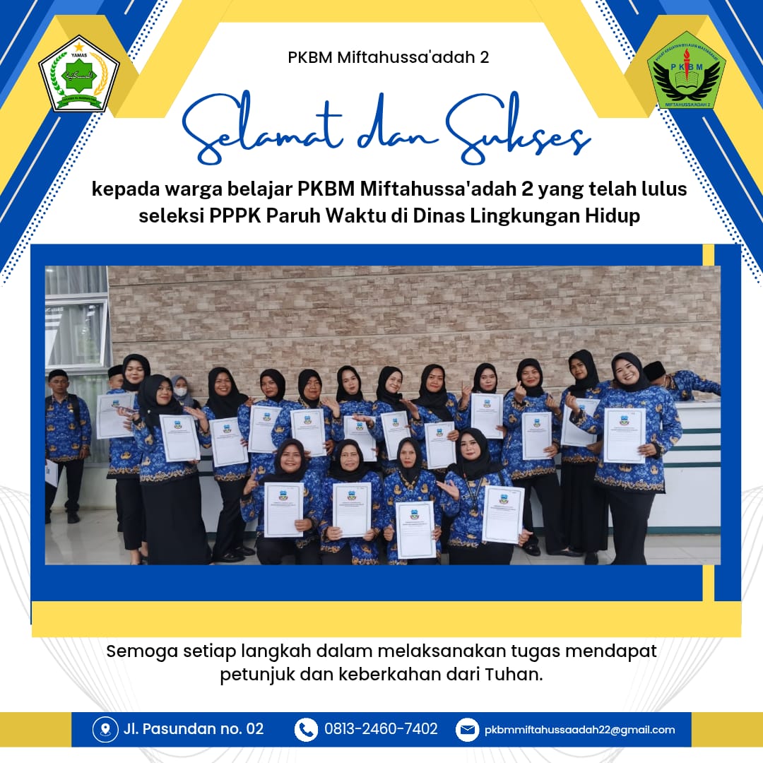 Lembaga pendidikan nonformal kembali membuktikan kualitasnya. Sebanyak 16 siswa dari PKBM Miftahussaadah 2 dinyatakan lulus sebagai Pegawai Pemerintah dengan Perjanjian Kerja (PPPK) Paruh Waktu dan ditempatkan pada instansi lingkungan hidup.