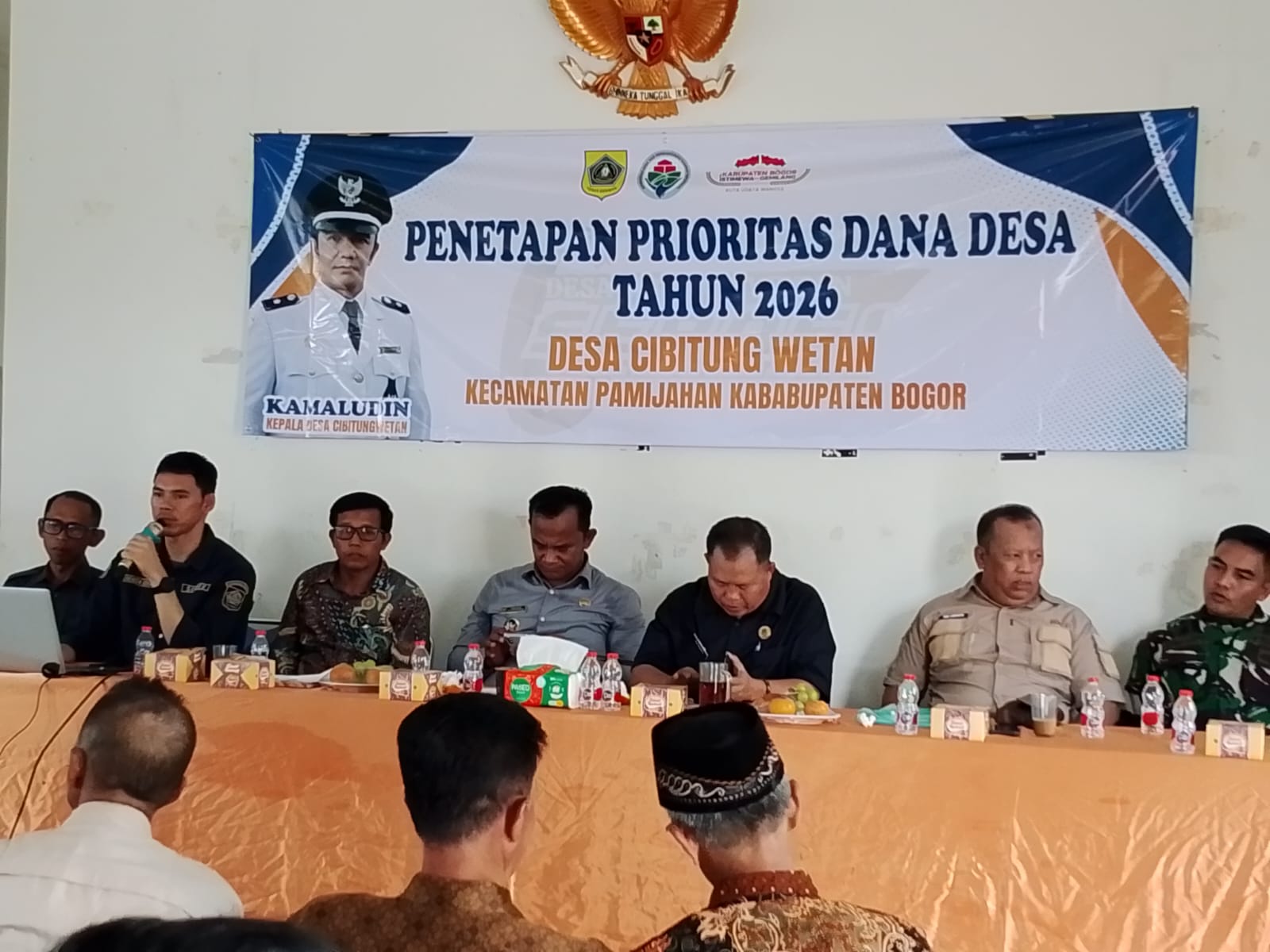 Pemerintah Desa Cibitung Wetan Kecamatan Pamijahan Kabupaten Bogor menggelar Musyawarah Desa (Musdes) Khusus untuk menetapkan daftar calon Keluarga Penerima Manfaat (KPM) Bantuan Langsung Tunai Dana Desa (BLT-DD) Tahun Anggaran 2026. Kegiatan tersebut berlangsung di Aula Kantor Desa Cibitung Wetan, Kecamatan Pamijahan, Kabupaten Bogor, pada Selasa (31/3/2026).